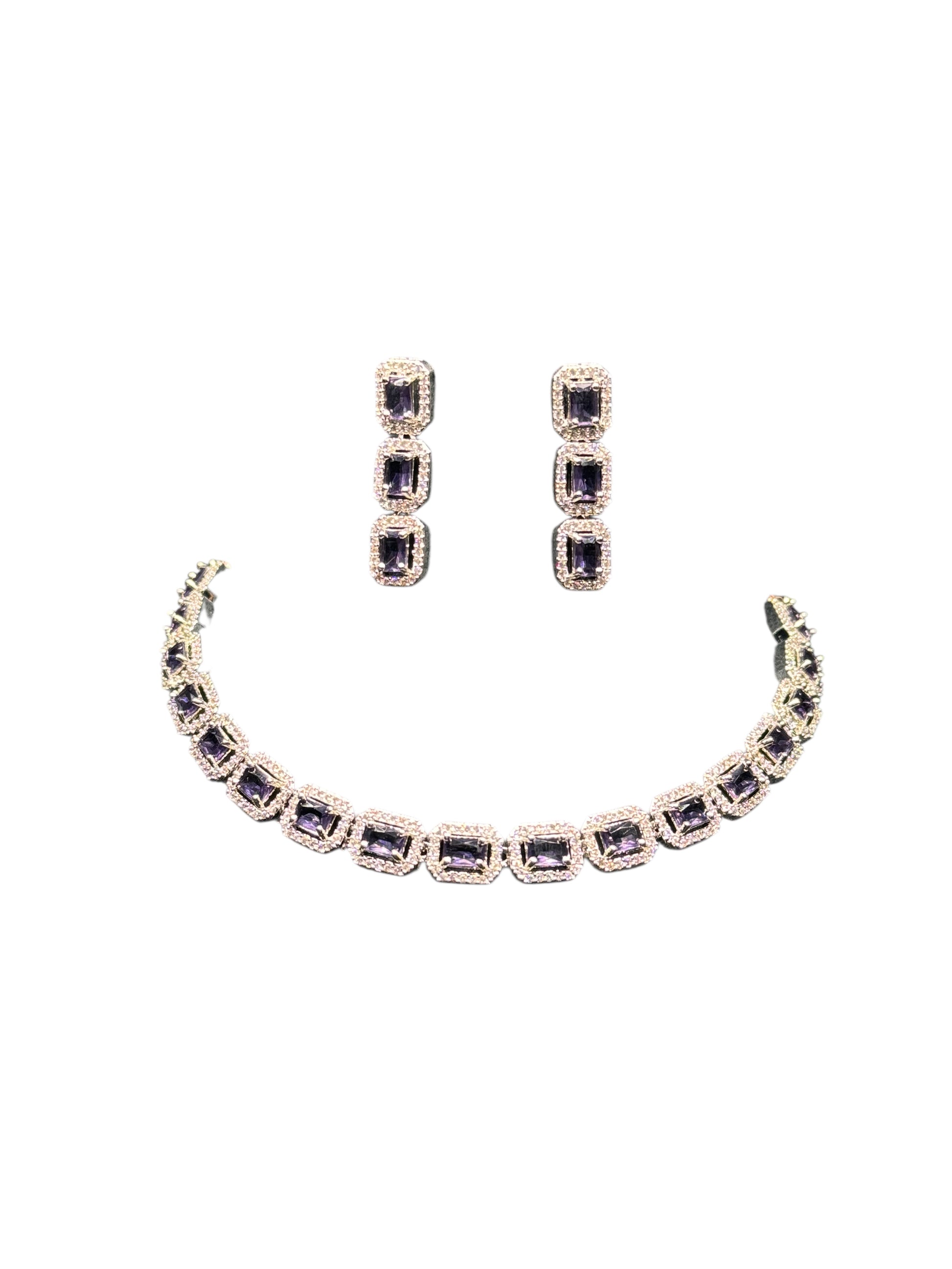 Elevate your style with this stunning premium necklace set featuring rich emerald-purple stones framed with sparkling American diamonds. The choker-style necklace pairs beautifully with matching triple-drop earrings, making it perfect for weddings, parties, and festive occasions.