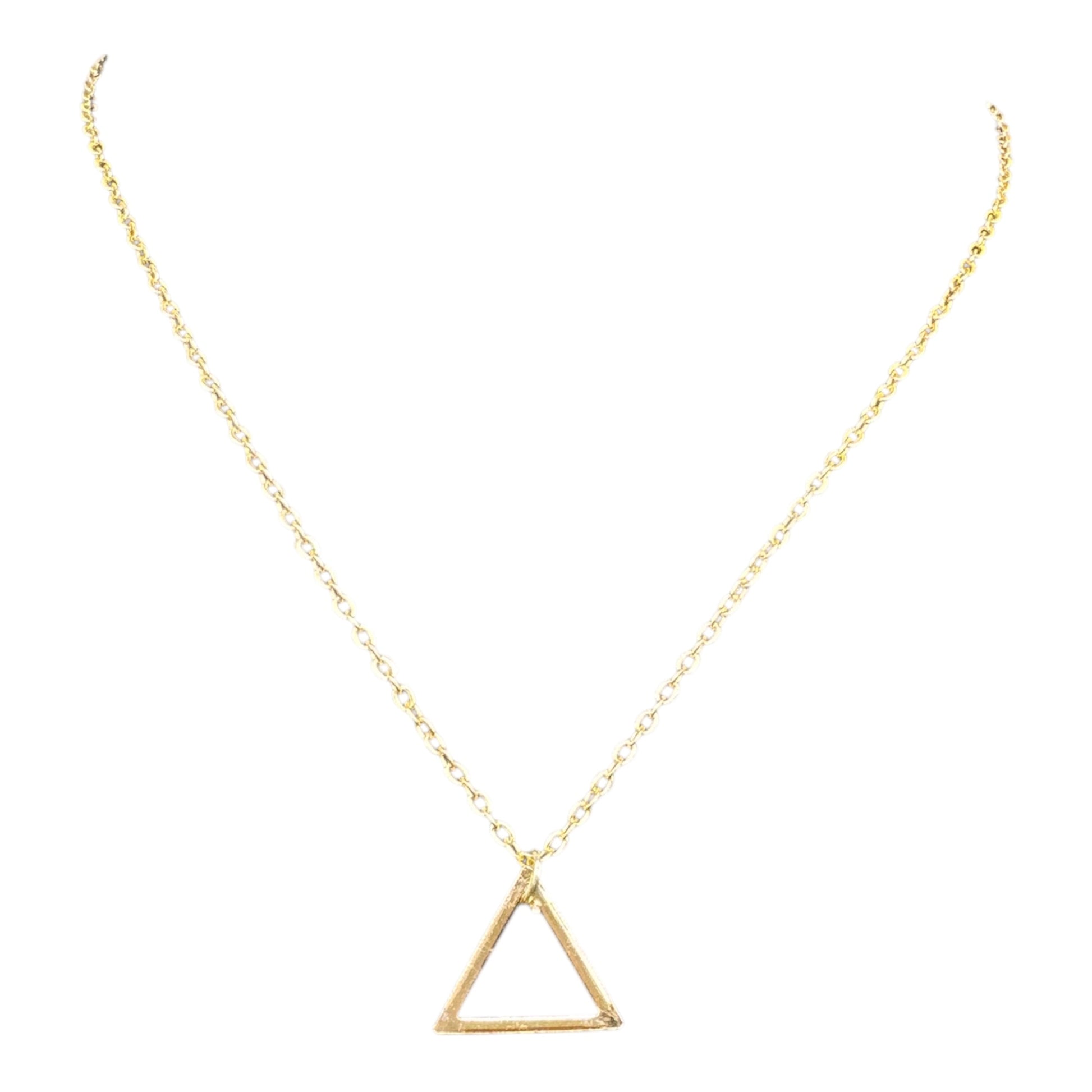 A cute gold-colored necklace with a simple triangle shape. This necklace is perfect for everyday wear. It's a simple and stylish piece that goes with any outfit.