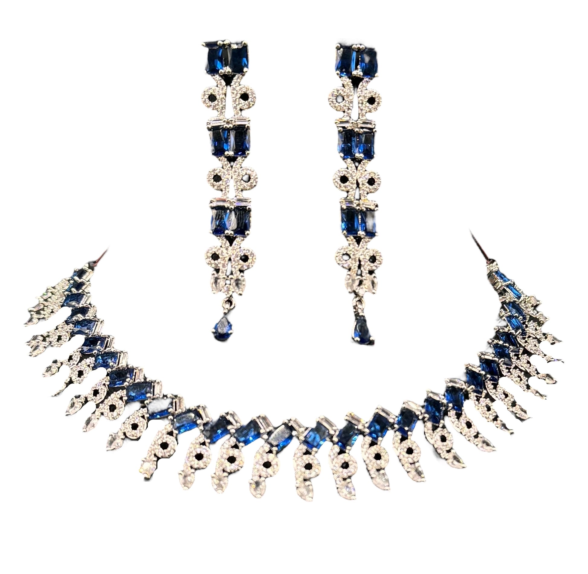 A bold and stylish jewellery set with deep blue stones and shiny silver work shaped like little wings. Comes with long matching earrings — perfect for festive looks and special events.