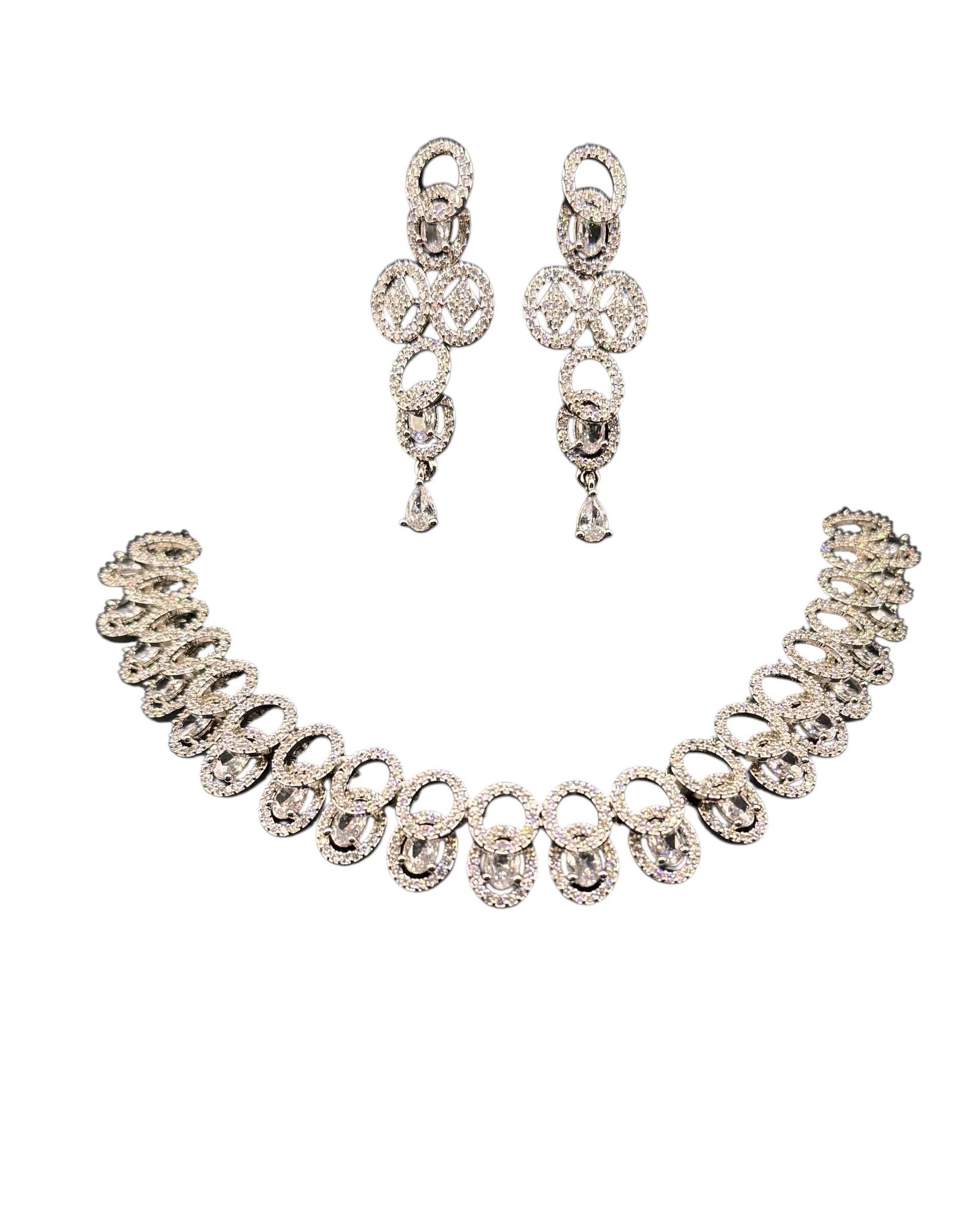 This elegant set features shiny silver loops with sparkling stones. The matching earrings and necklace add a modern and stylish touch — perfect for parties or festive occasions.